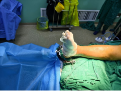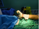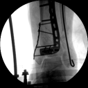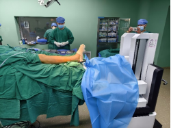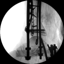 1.CO外固定半環連接跟骨穿針并通過CO接骨機器人配套的連接桿與CO接骨器人中間機械臂相連,調整機械臂,進行骨折端初步復位,C臂確認復位滿意,關節間隙拉開。