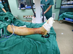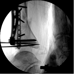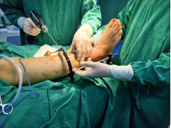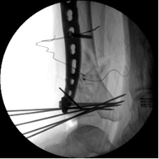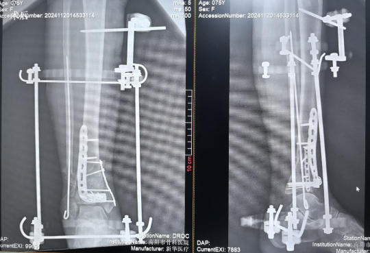 3.在脛骨近端穿入一根克氏針,連接CO外固定架進行固定,并外踝處穿入一根克氏針進行固定。C臂透視位置滿意,縫合結束手術。